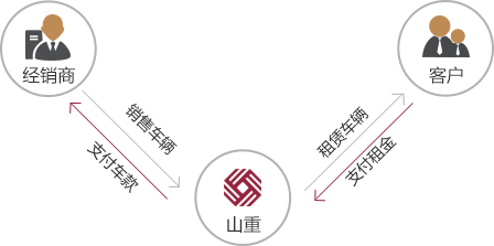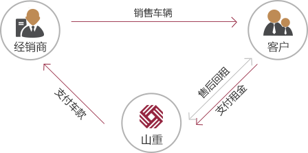 經銷商向山重租賃推薦購車客戶,客戶與山重租賃操作售后回租;山重租賃向經銷商支付車款,客戶按期向山重租賃償還租金。